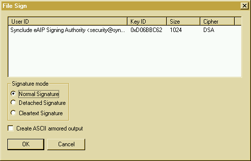 From the File Sign dialogue box, select Normal signature in order to have the signature appended to the file. De-select Create ASCII armoured output. Click OK.