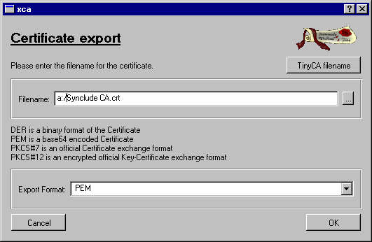 You need to export the CA certificate in order for other people to use it. Click on the certificate, and click on the Export button on the right. You are presented with the export interface. Enter: