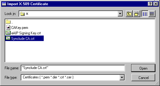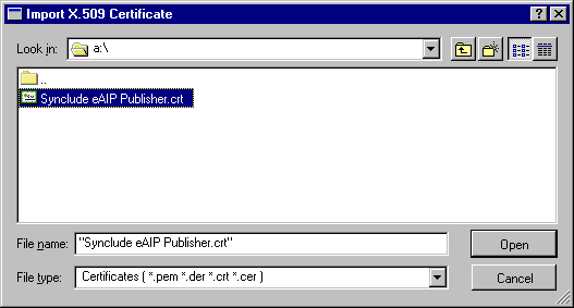 Navigate to the location of the certificate received from the CA. For example, if received on a floppy, navigate to A:\Synclude eAIP Publisher.crt.