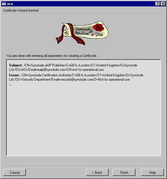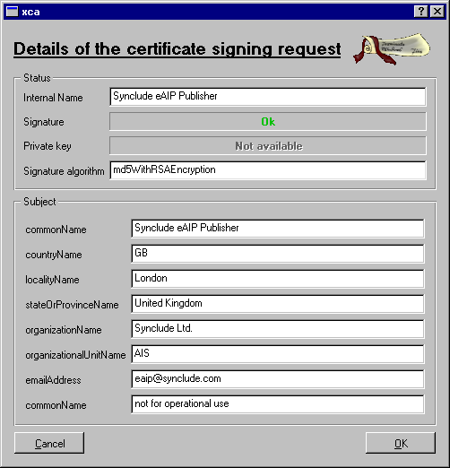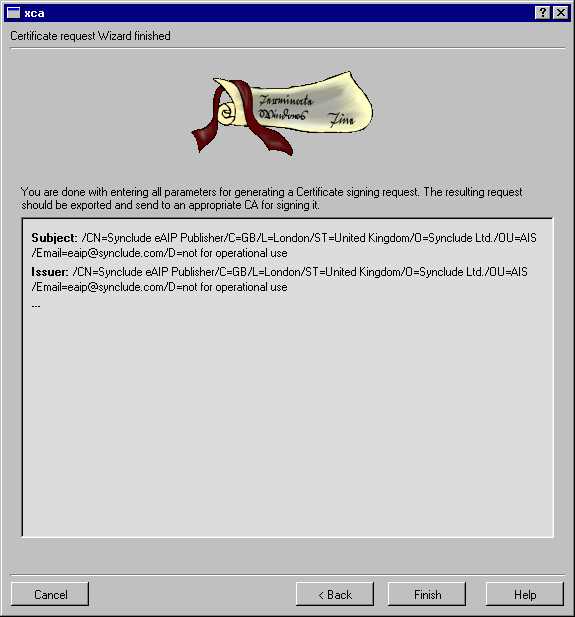 Send the exported CA certificate to the person creating the signing key. You now have to wait for that person to send their Certificate Signing Request. This file will also be sent to all end-users to validate the signed eAIP packages sent by your organisation, as well as its associated fingerprint.