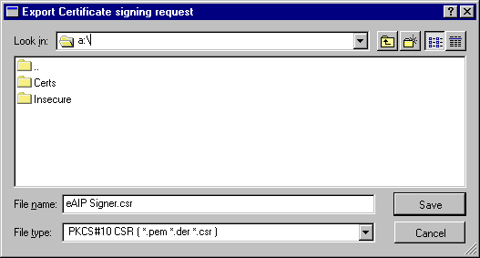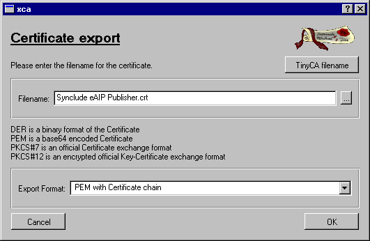 In the Filename box, enter the path where you want to store the certificate, followed by the filename. For example: A:\Synclude eAIP Publisher.crt will save it on a floppy disk.