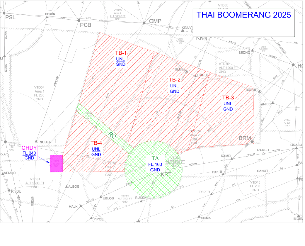Joint military exercise named THAI BOOMERANG 2025 will take place within the Bangkok FIR from 9 September - 18 September 2025 between 0130 - 0900 UTC. except Saturday and Sunday, details are as follows.