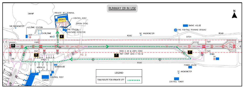 Taxiing procedures to/from Apron E for departing and arriving private jet are prescribed as follow:
