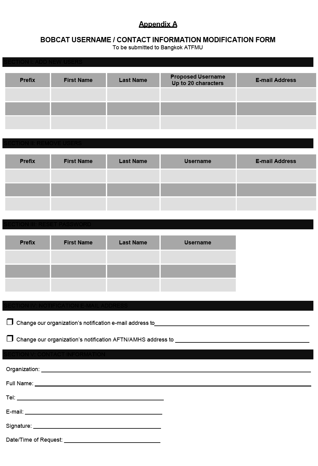 2.6.2 Affected operators who do not have dedicated BOBCAT username/password access should complete the attached application form in Appendix A and email the form to the Bangkok ATFMU as soon as possible.