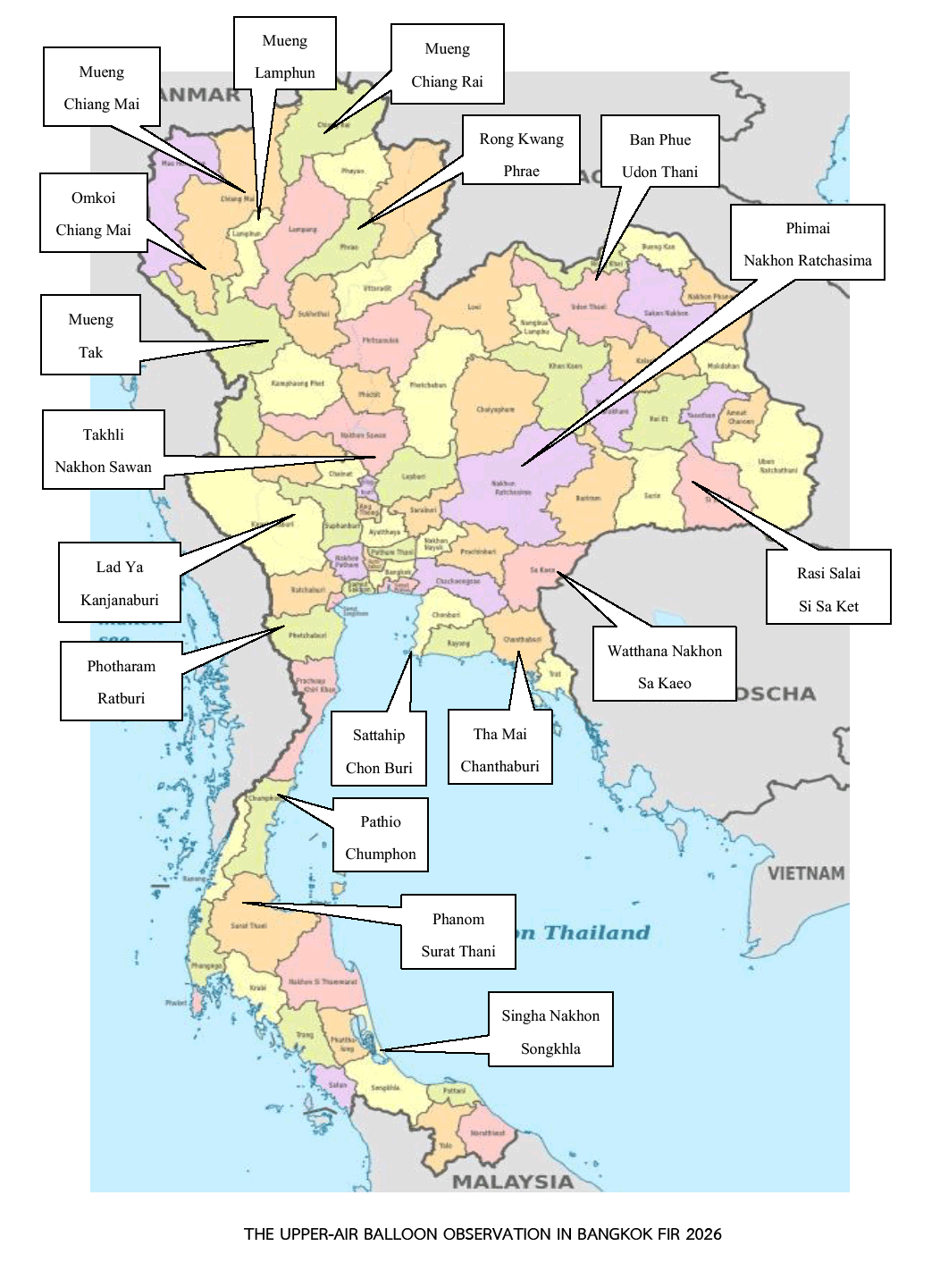 With effect from 1 January 2026 at 0000 UTC to 31 December 2026 at 0800 UTC, pilots are warned that upper-air observations balloon will be operated routine daily by Department of Royal Rainmaking and Agricultural Aviation, Ministry of Agriculture and Cooperatives. The details are as follows: