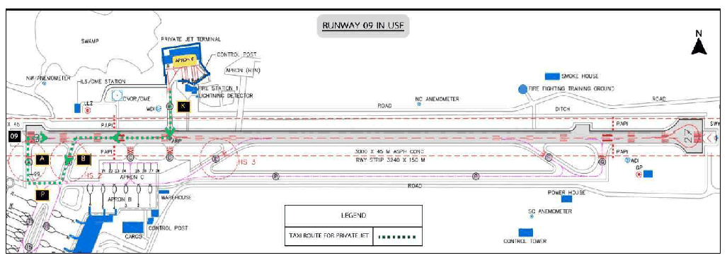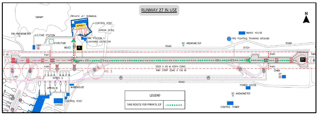 Taxiing procedures to/from Apron E for departing and arriving private jet are prescribed as follow: