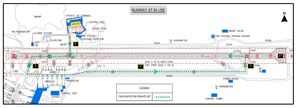 Runway 27 in use: aircraft shall taxi via Taxiway K then enter and taxi down on runway to vacate at Taxiway B and taxi via Taxiway P and G (or H, J) to holding point runway 27 or as directed by ATC. (For aircraft departure from intersection Taxiway G, runway remaining distance is 2500 m)
